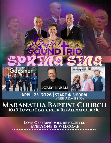 The Joyful Sound Trio is truly honored to serve our Savior in song, testimony, and the preached Word of God!!! One of our greatest joys in life is to ’sing for our King’!!! The trio is made up of Kevin Mundy(baritone, bass), Anna Mabry(lead, alto), and Drew Mabry(lead, tenor). We are from the mountains of Western North Carolina in the Barnardsville/Weaverville area! If your church or organization would like to have the Joyful Sound Trio to come minister in song, please contact us and we would be honored to be with you!! We have a song to sing because HE is our song!!!